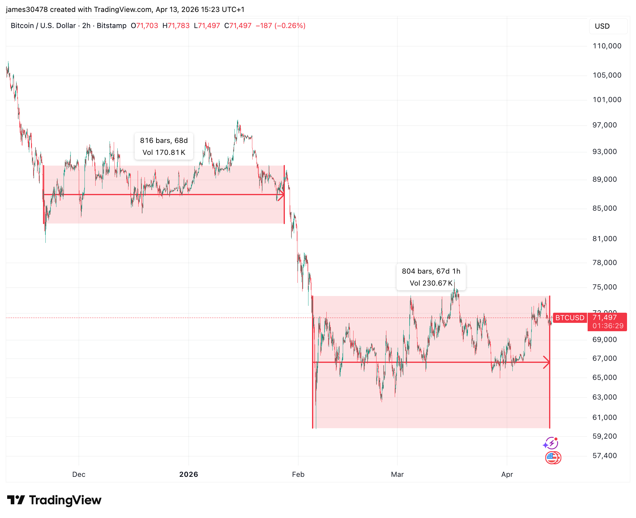 Bitcoin has now been consolidating for 67 days since its local bottom on Feb. 5 at $60,000, almost identical to the 68-day consolidation between Nov. 21 and Jan. 28, which preceded a plunge from roughly $90,000 to $60,000 in the span of a week. Bears pine for a repeat, perhaps a retest of the 200-week moving average around $60,000, like a metronome waiting for the drumbeat of doom.