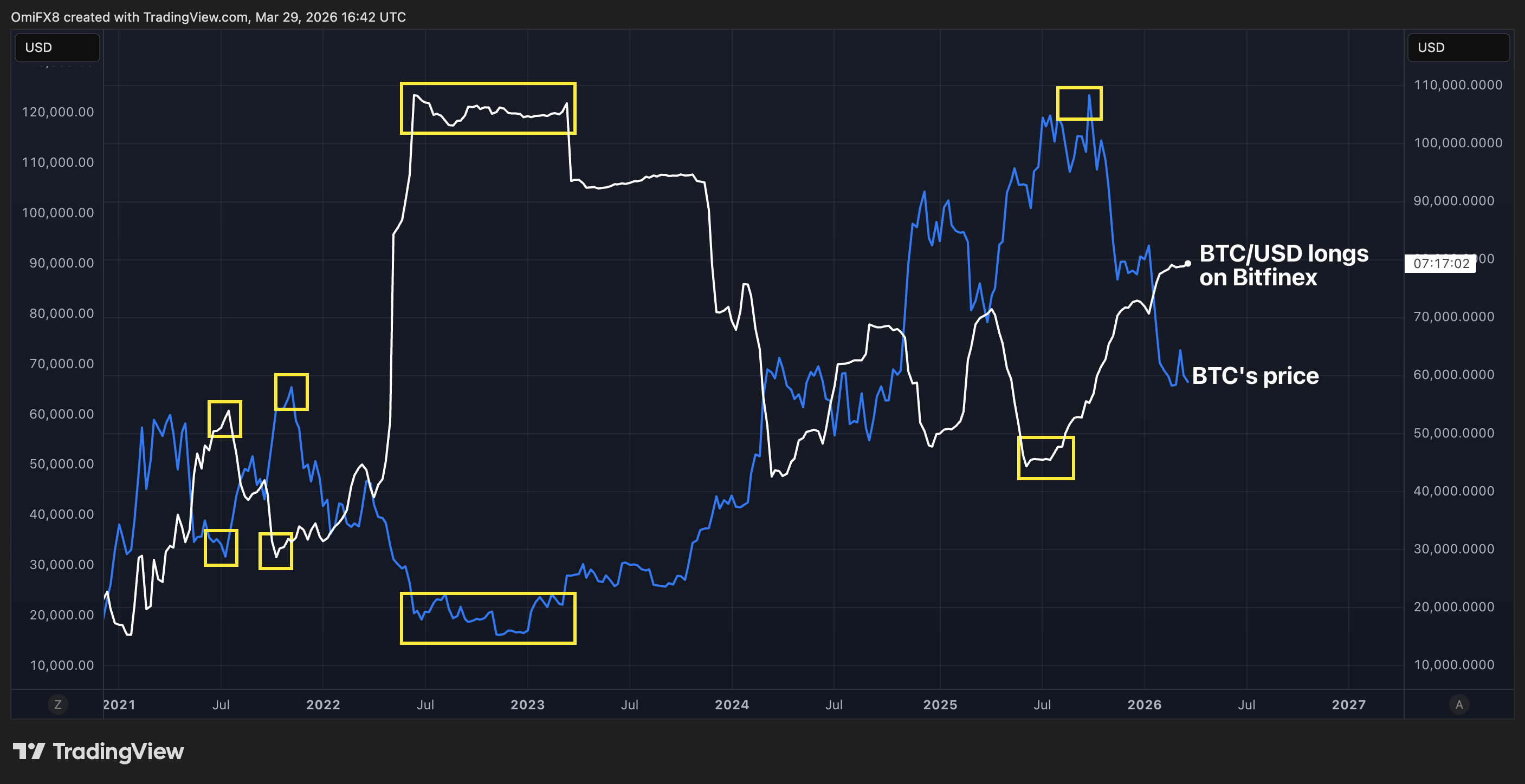 Bitcoin bullish bets hit a 28-month high on Bitfinex, and that’s music to bears’ ears