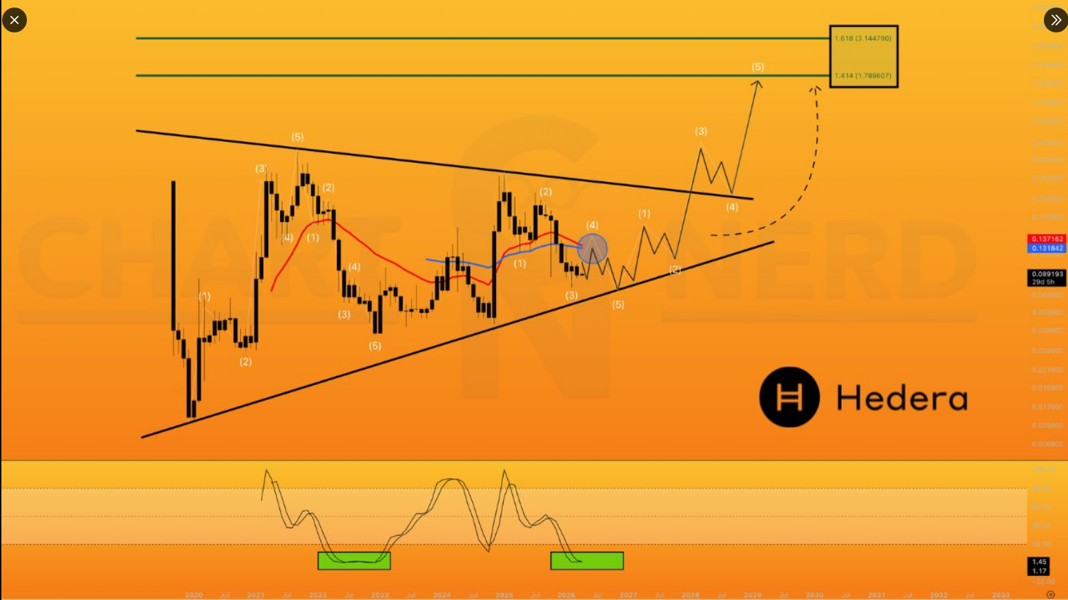 Crypto analyst ChartNerd spoke of a long-range target of $1.80 still in play, but the setup depends on a clear break above resistance. The chart view shows a converging triangle, higher lows forming beneath and lower highs pressing down from above. In such geometry, price action compresses like a conscience under pressure, waiting for a sharp act to give it breath again.