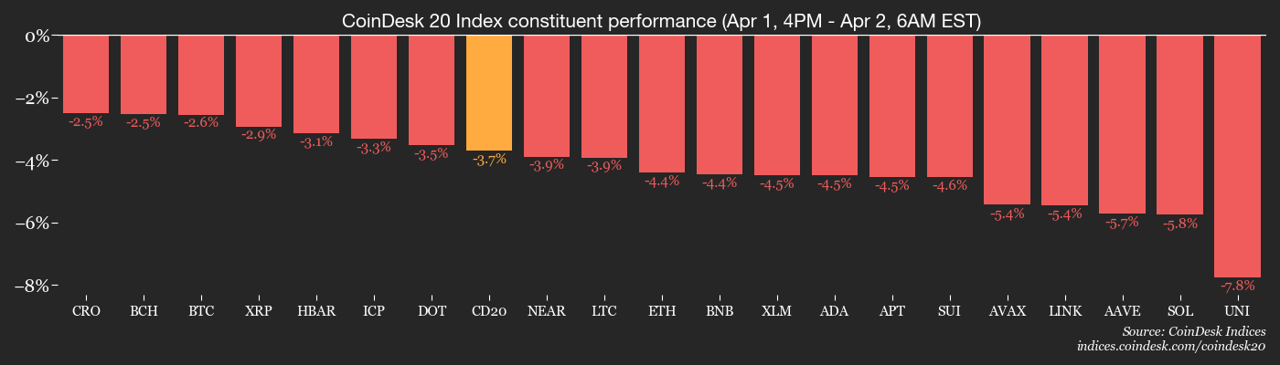 - CoinDesk 20 is down 3.59% at 1,891.30 (24hrs: -3.81%)