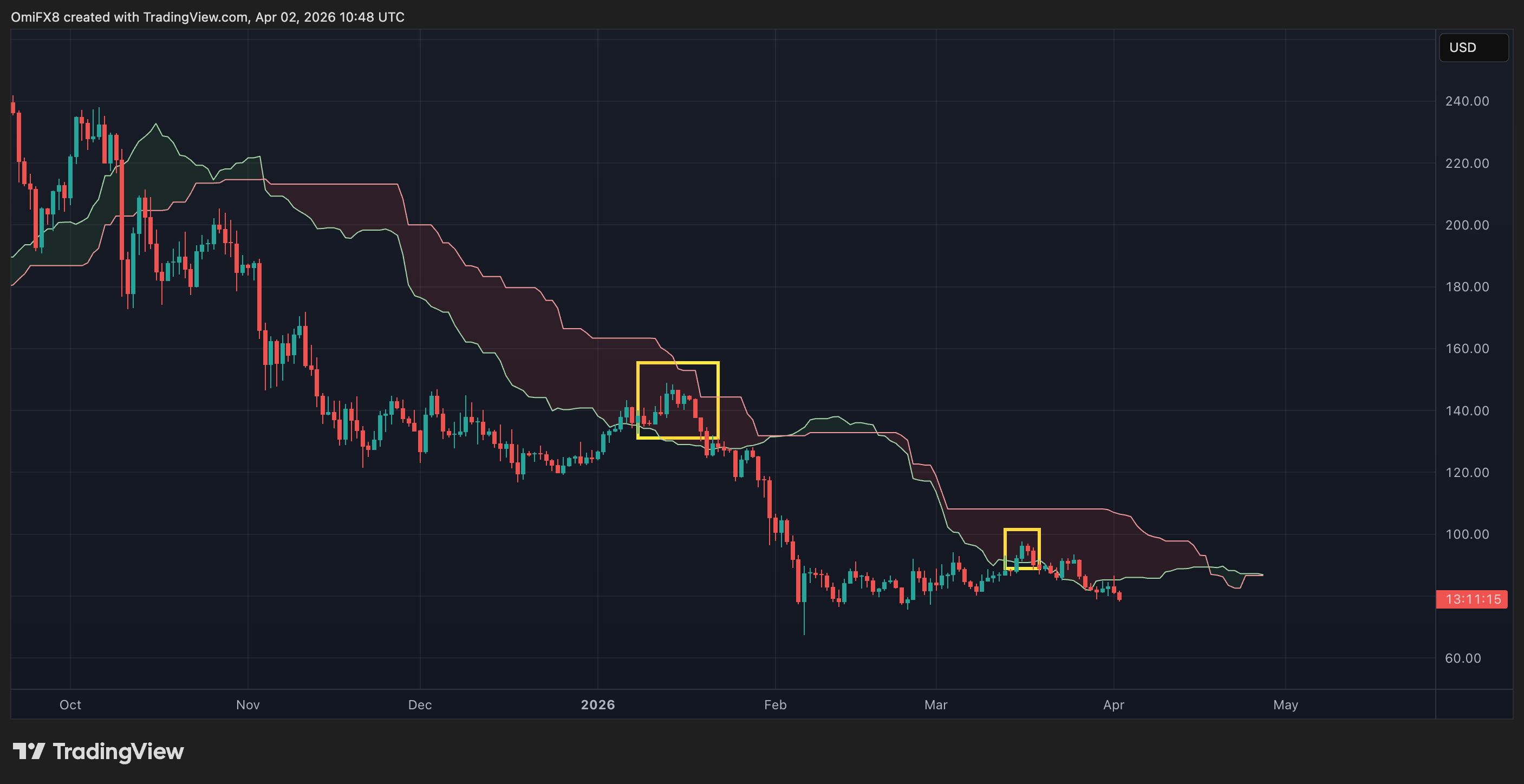 - The token’s price has crossed back below the cloud, indicating continuation of the broader decline. The pattern is similar to what we saw in mid-January, following which prices dropped sharply.